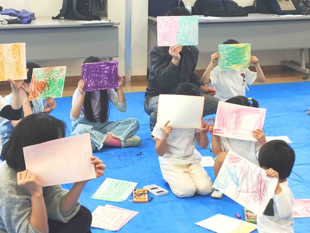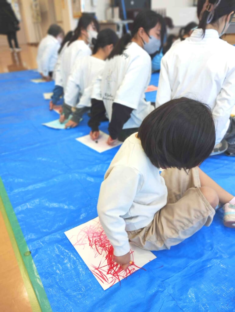 完成まで自分では見えない「背中」に描くという、はじめての描き方を体験し作品を完成させました。