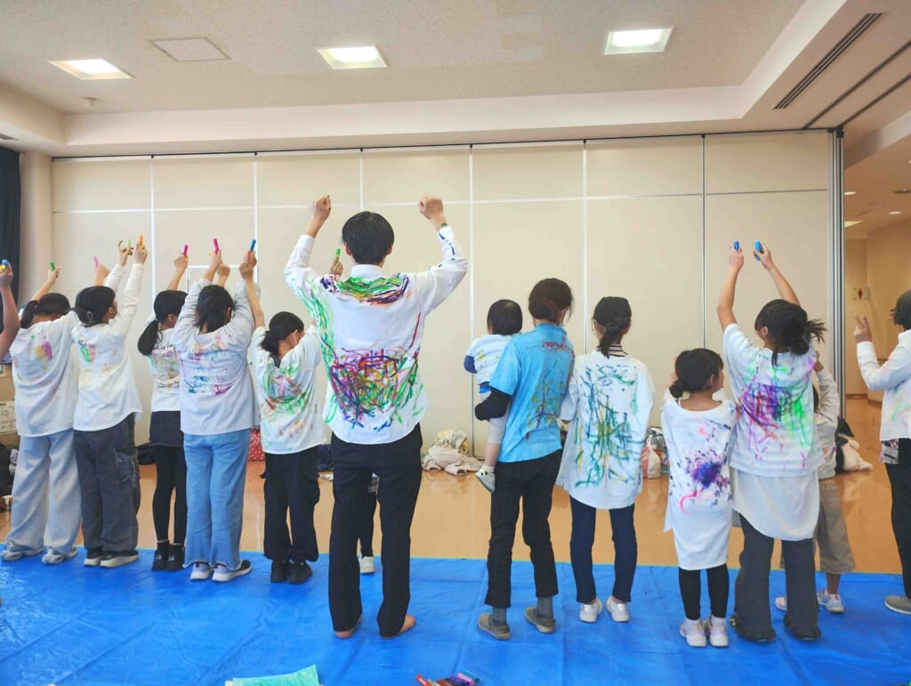 思い思いの色を選び、全身をつかって「背中」に描くワークショップを開催しました。
