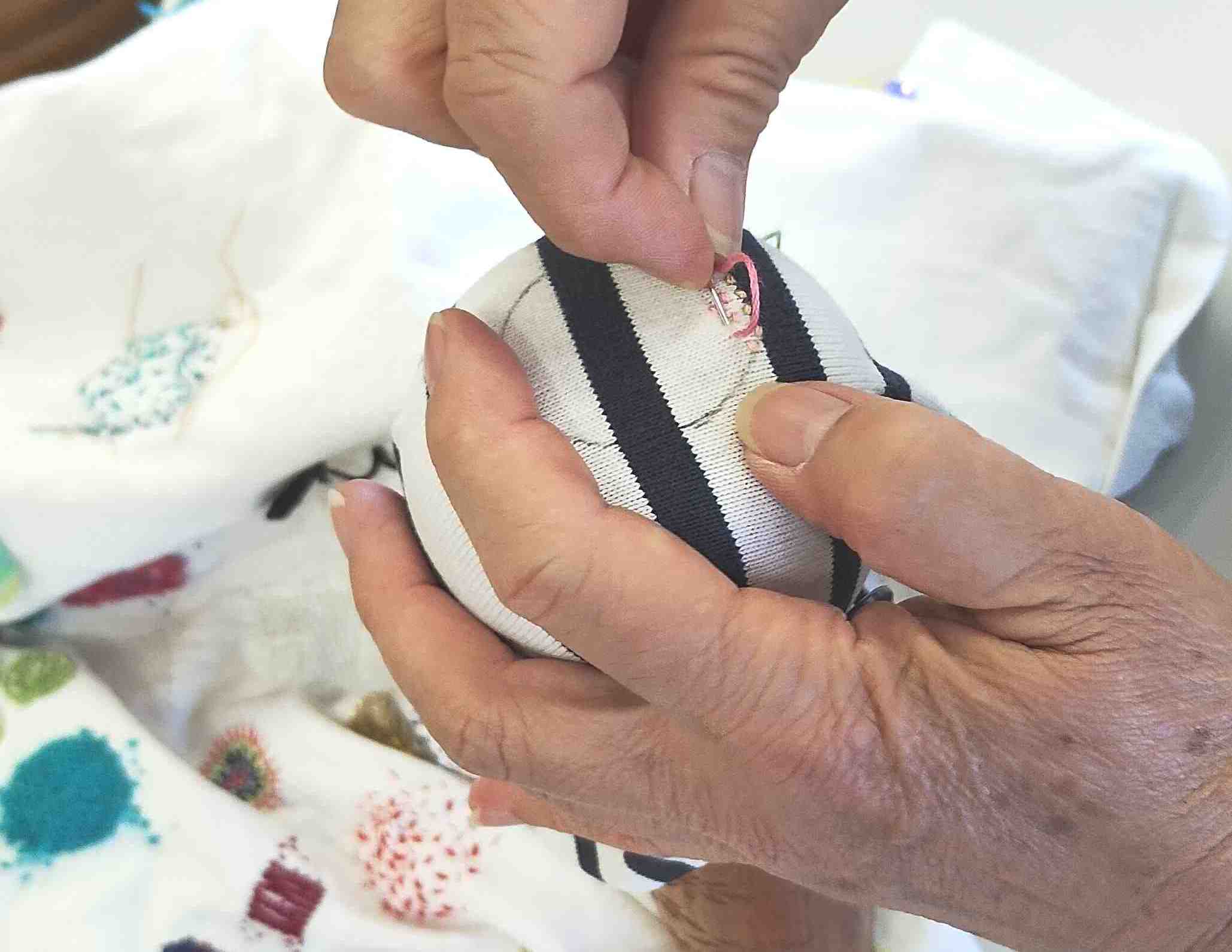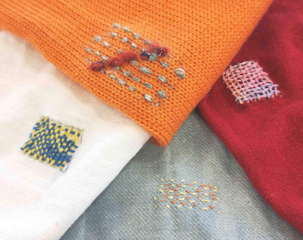 穴あきや擦り切れ、シミができた衣類を、いろとりどりの糸や布で繕う「ダーニング」を体験し、