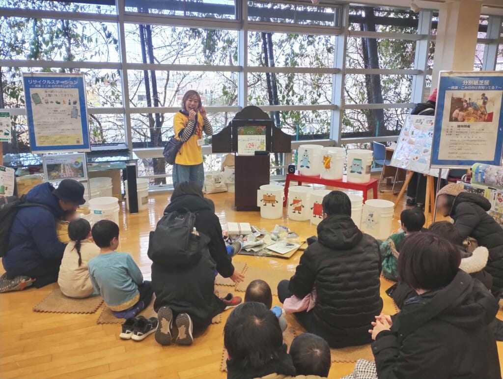 2階にあがると、滝沢ごみクラブ紙芝居広げ隊ともちさんの「分別紙芝居」を開催。